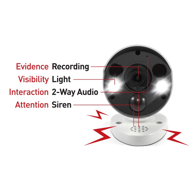 The 2 Sensor Spotlight Cameras turn the lights on & trigger recording in full color when they detect heat. The 2-way audio & siren let you talk back & scare off intruders.
