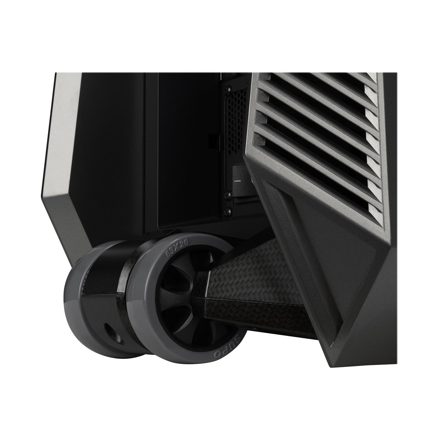 A massive side window panel showcases the striking and powerful interior with a design that keeps electromagnetic interference (EMI) levels in check despite the size of the opening. Outfitted with two handles and wheels covered with a carbon fiber pattern, the rigs can be easily moved from one location to another.