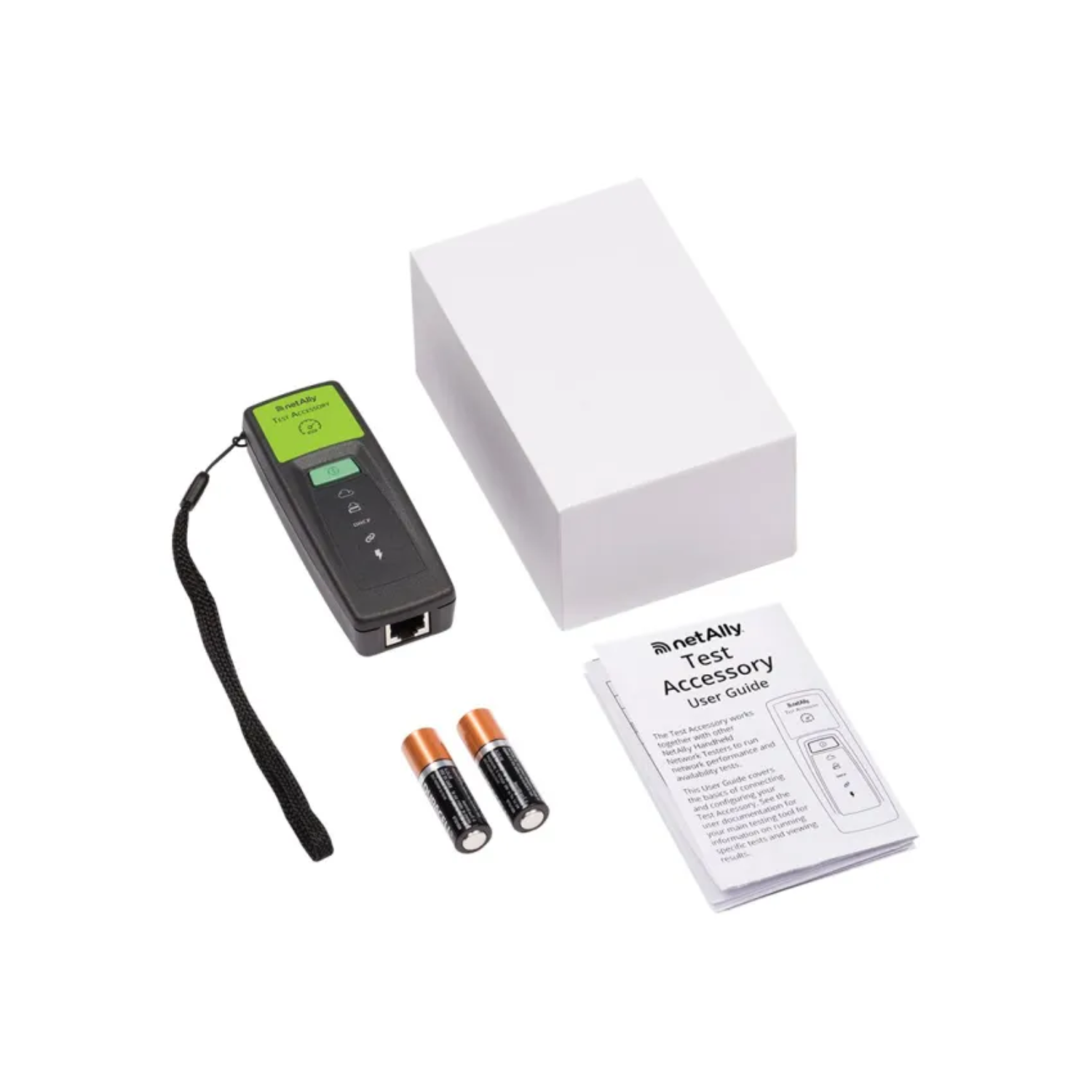 Perfect for technicians needing a standalone iPerf3 accessory, including wrist strap, AA batteries, and quick‑start guide.