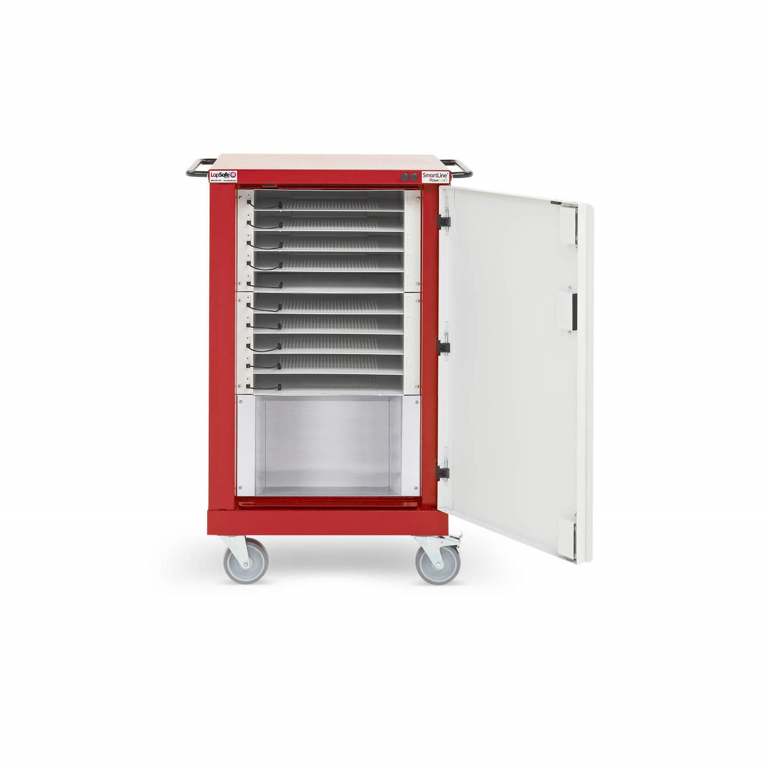 This LapSafe High Security Laptop Trolley / Cabinet and Charging Station is the Mini Mentor™ MINI/SE/015 option. The Mini Mentor™ MINI/SE/010 is designed with 10 standard Laptop bays and is ideally suited to smaller classrooms or where devices are shared between students. The Mini Mentor™ MINI/SE/010 includes LapSafe's low voltage ultra-safe smart charging system called SmartLine™. SmartLine™ is designed to provide large power savings by sensing when charging power is no longer necessary and then going into stand-by mode reinstating power as needed. SmartLine™ is energy efficient,child safe preventing access to the live power supply and requires no AC Adaptors. 1 SmartLine™ module will charge 5 bays each housing 1 Laptop. Below is a full list of the contents of this model: